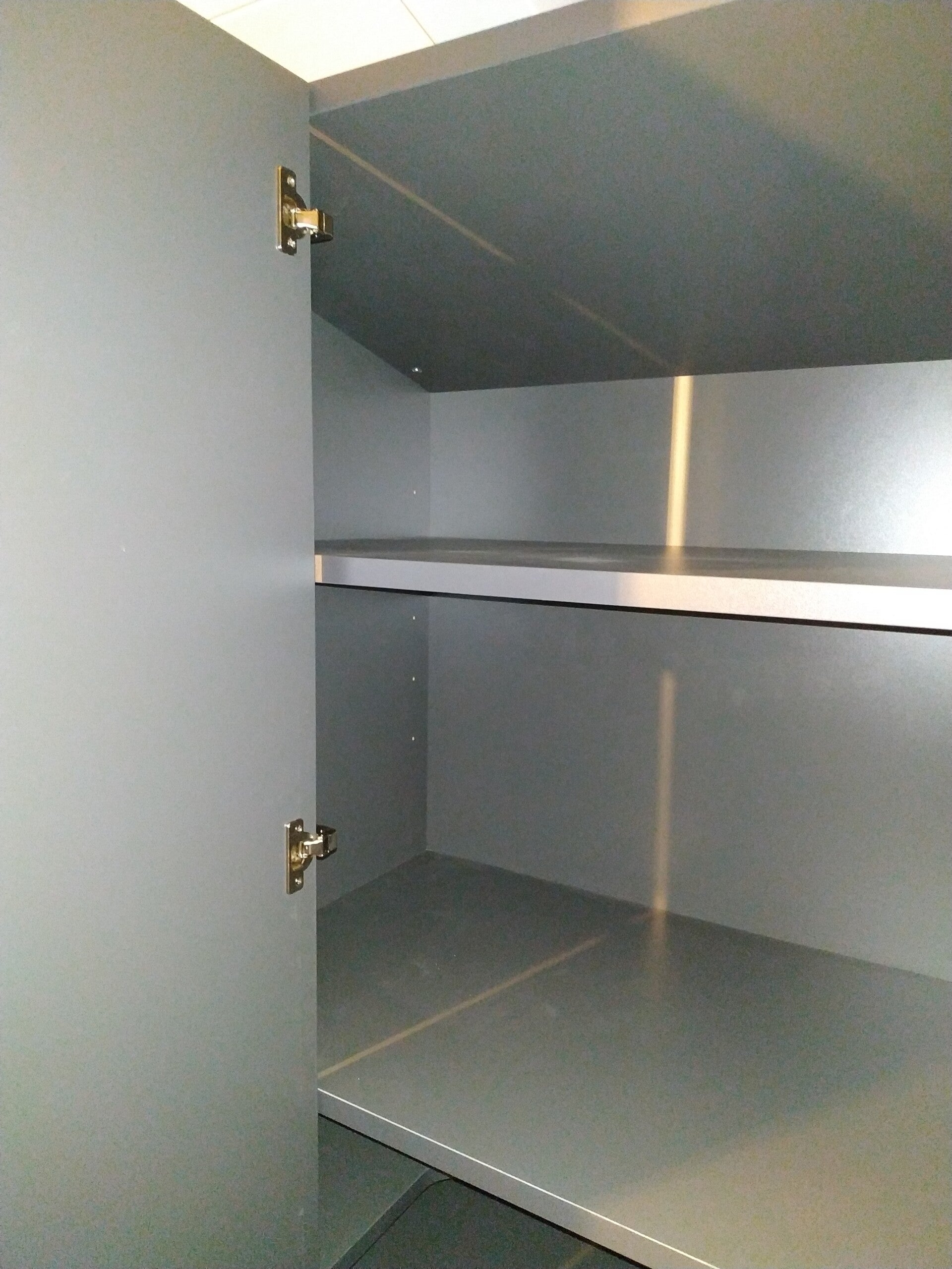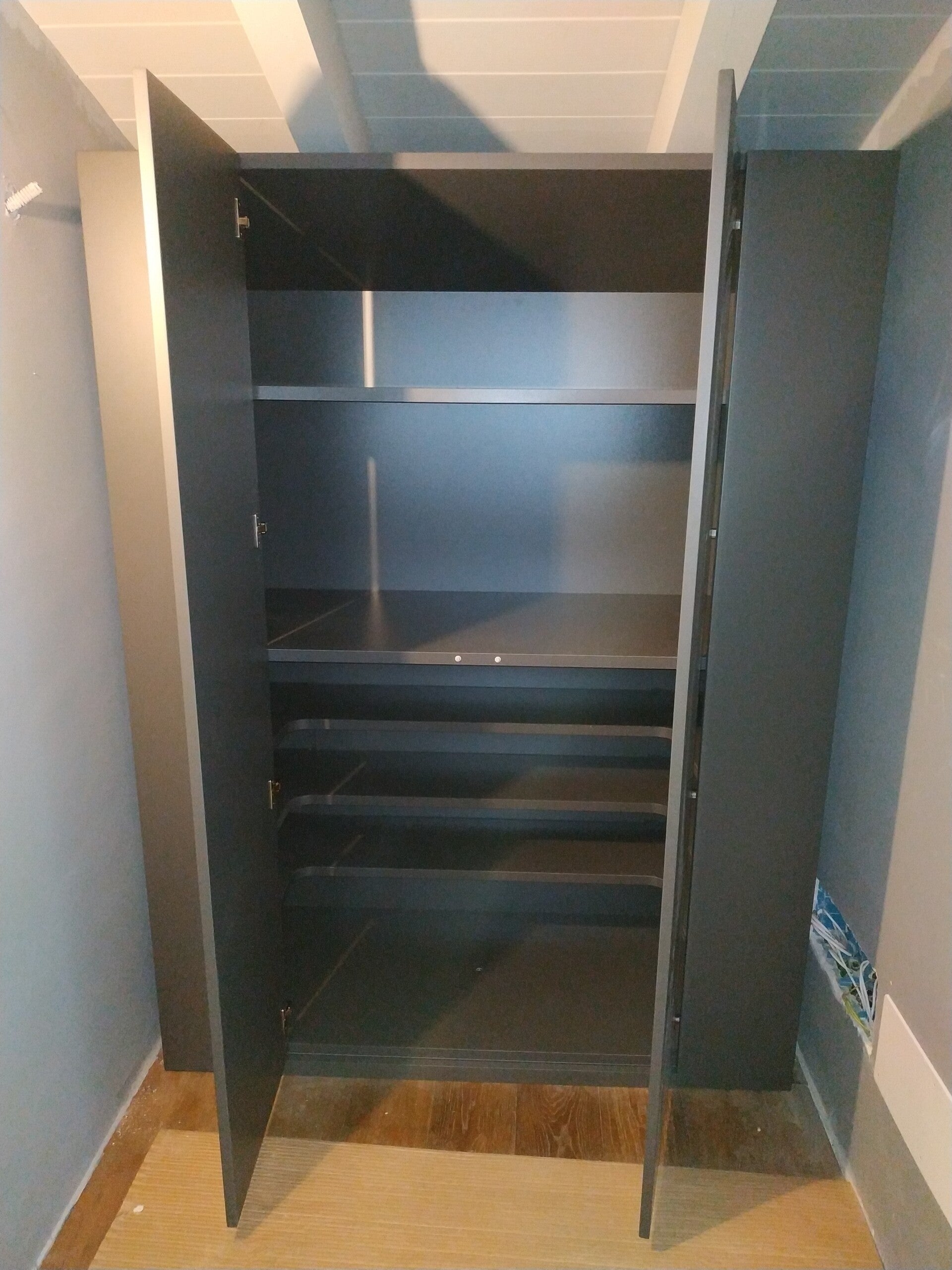 Scarpiera in nobilitato grigio ante laccate, su misura in randa. Cavallasca(CO)