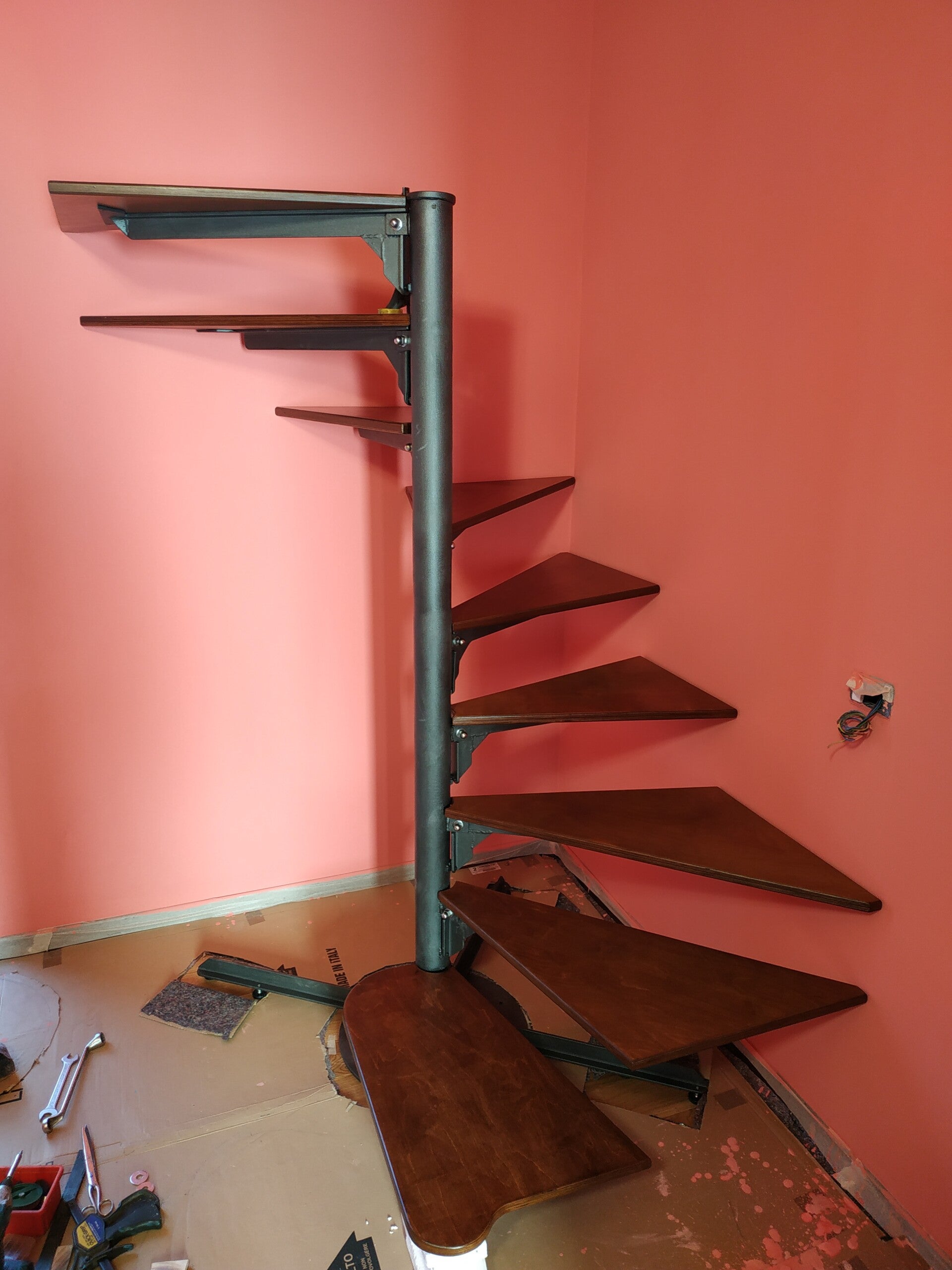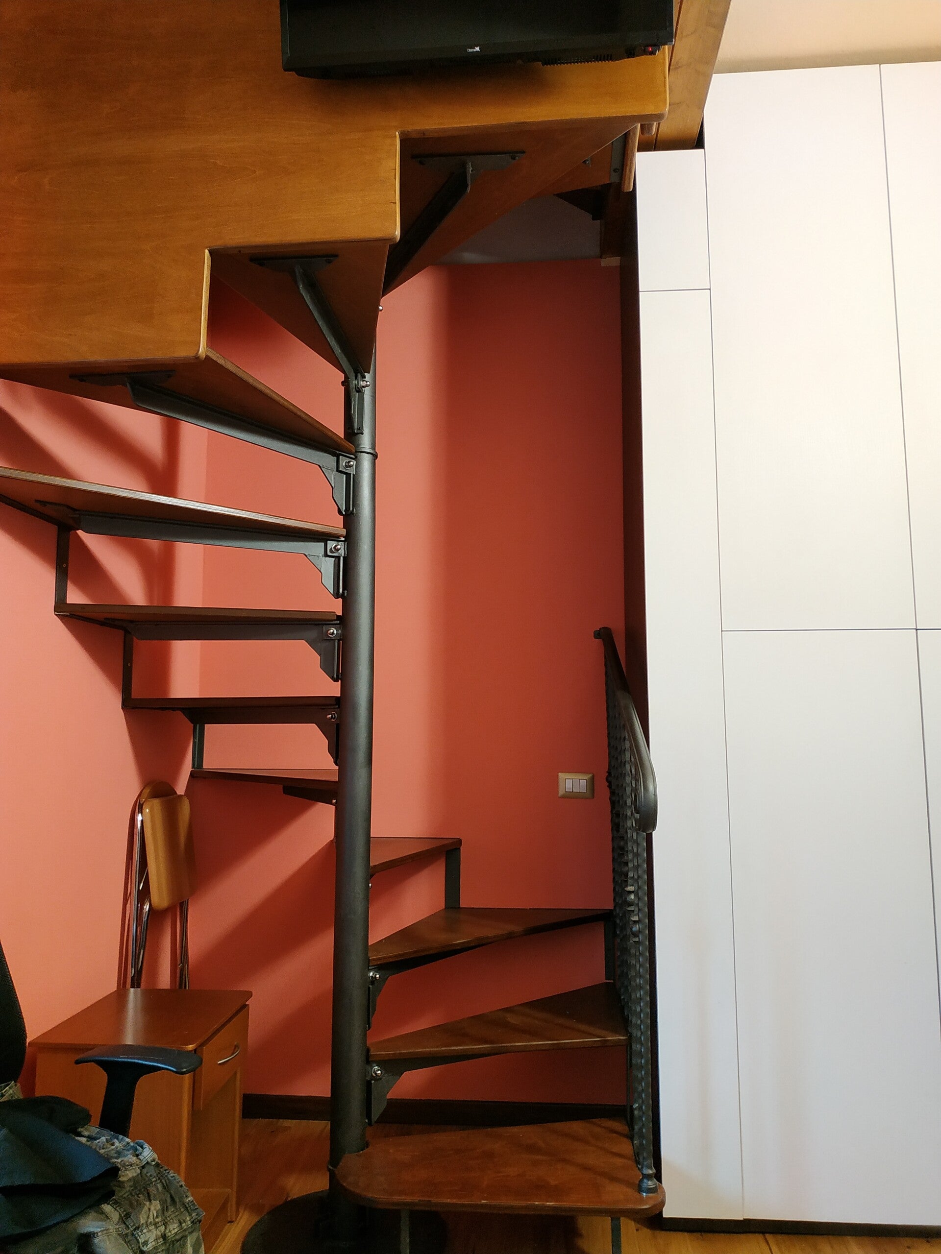 Scala a chiocciola gradini in legno e struttura in metallo. Milano (MI)