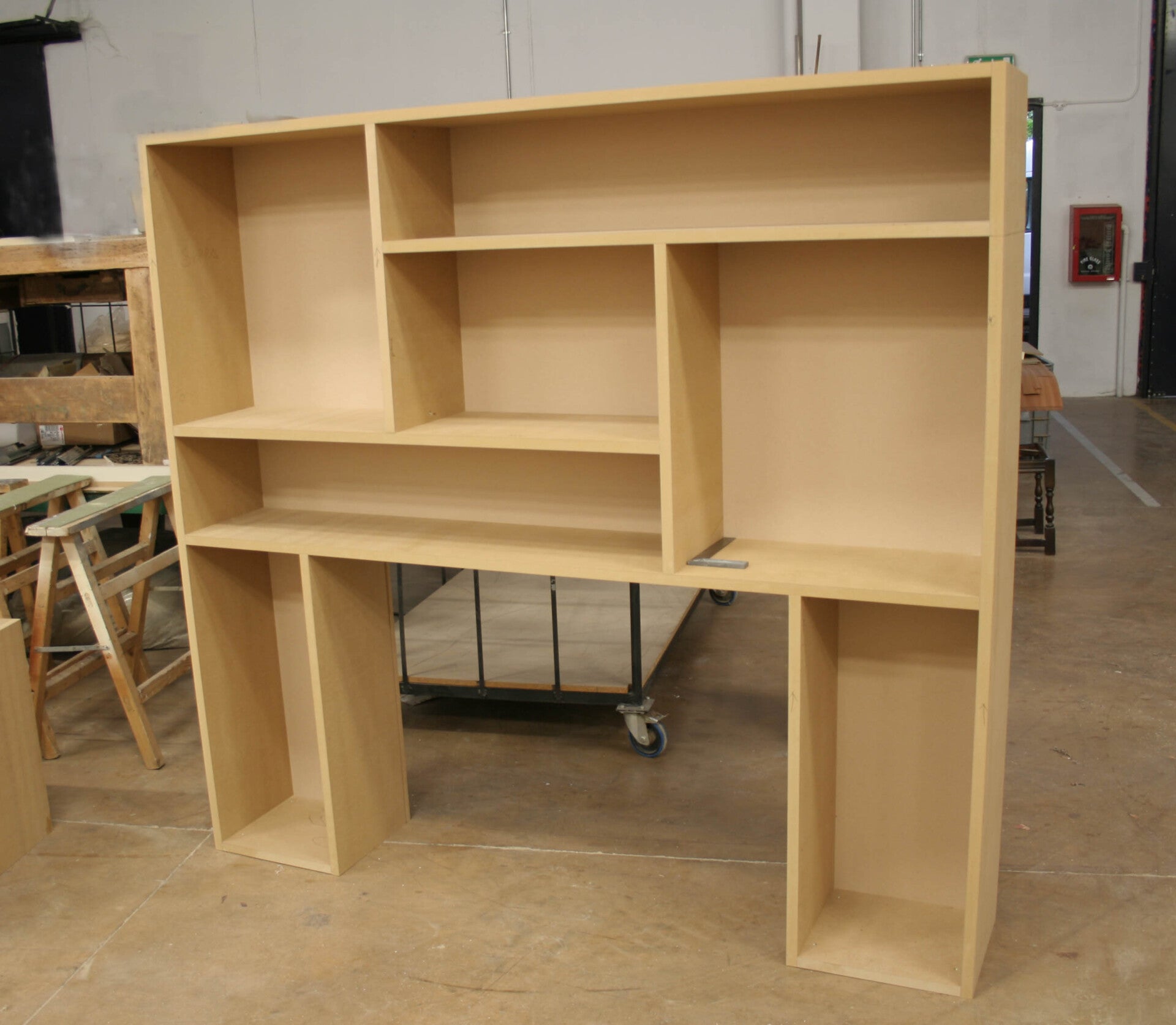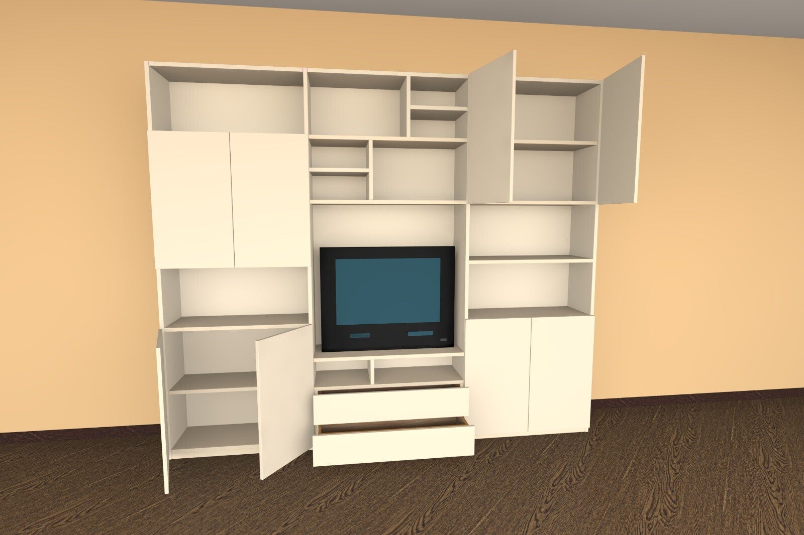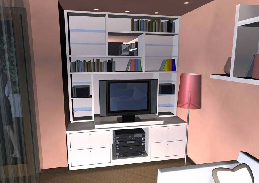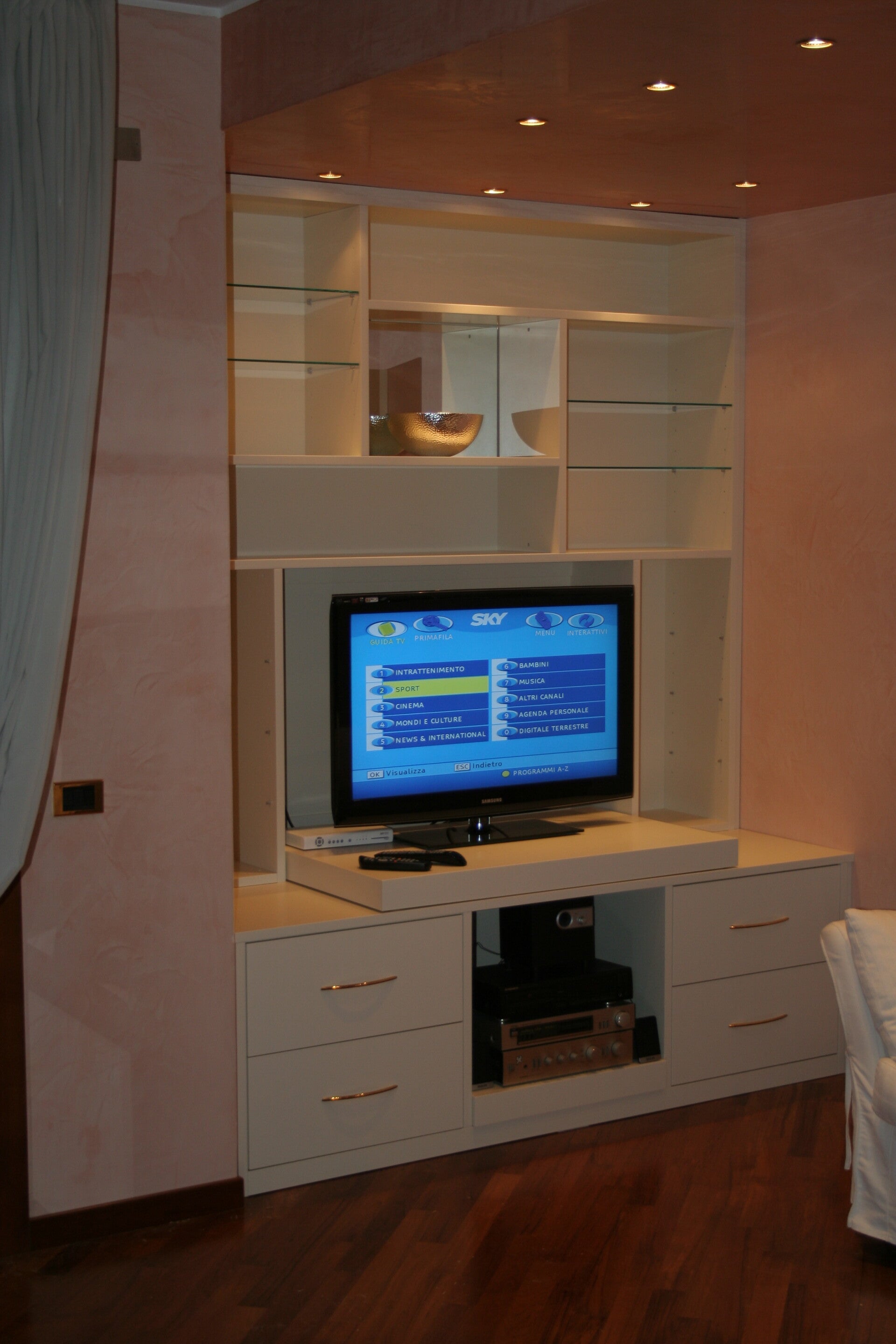 Soggiorno su misura per televisore e impianto stereo, con ripiani, mensole e specchio. Arese (MI)