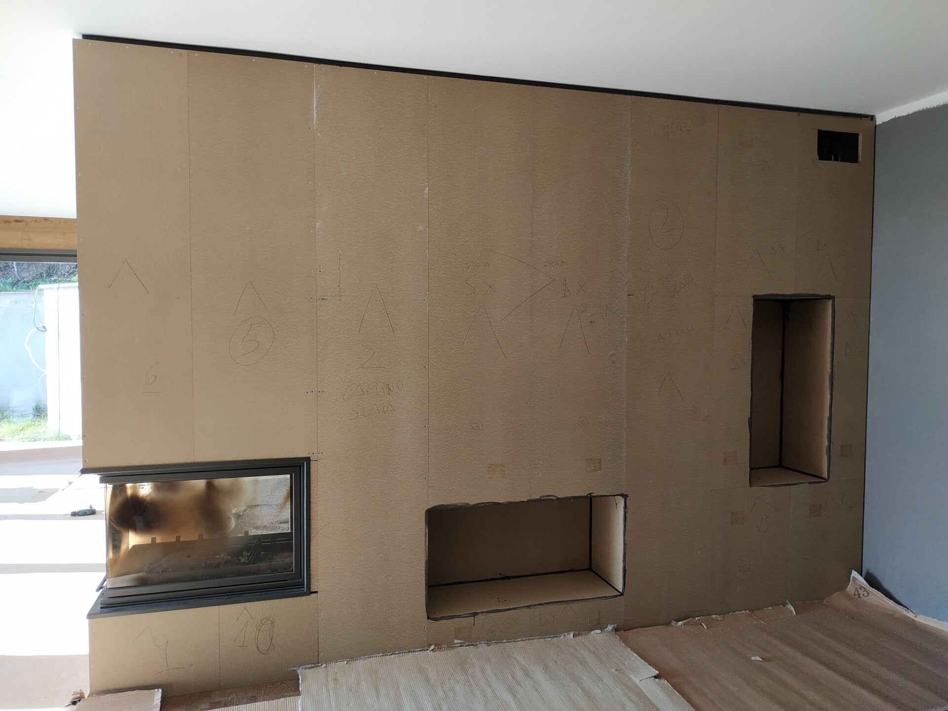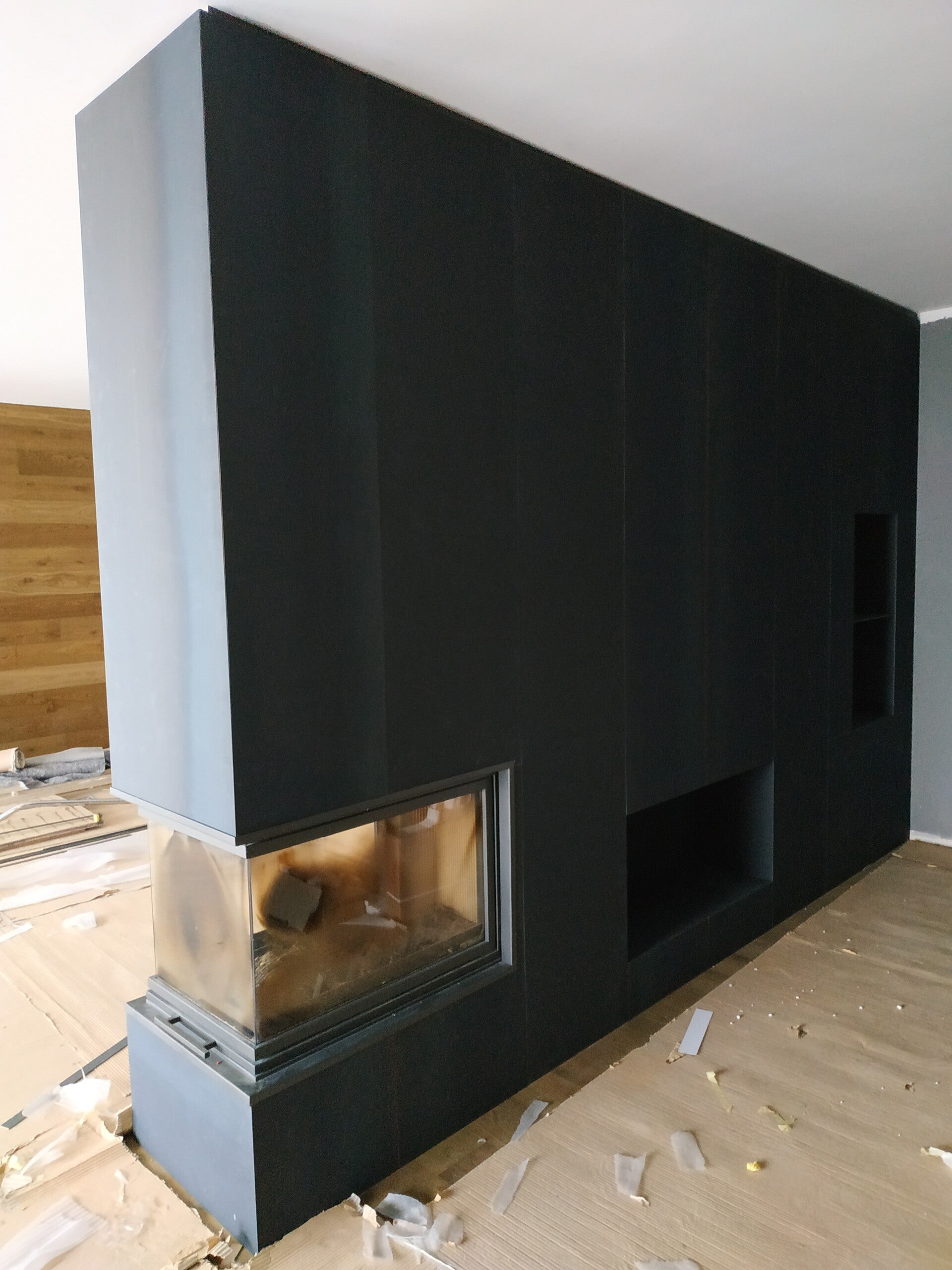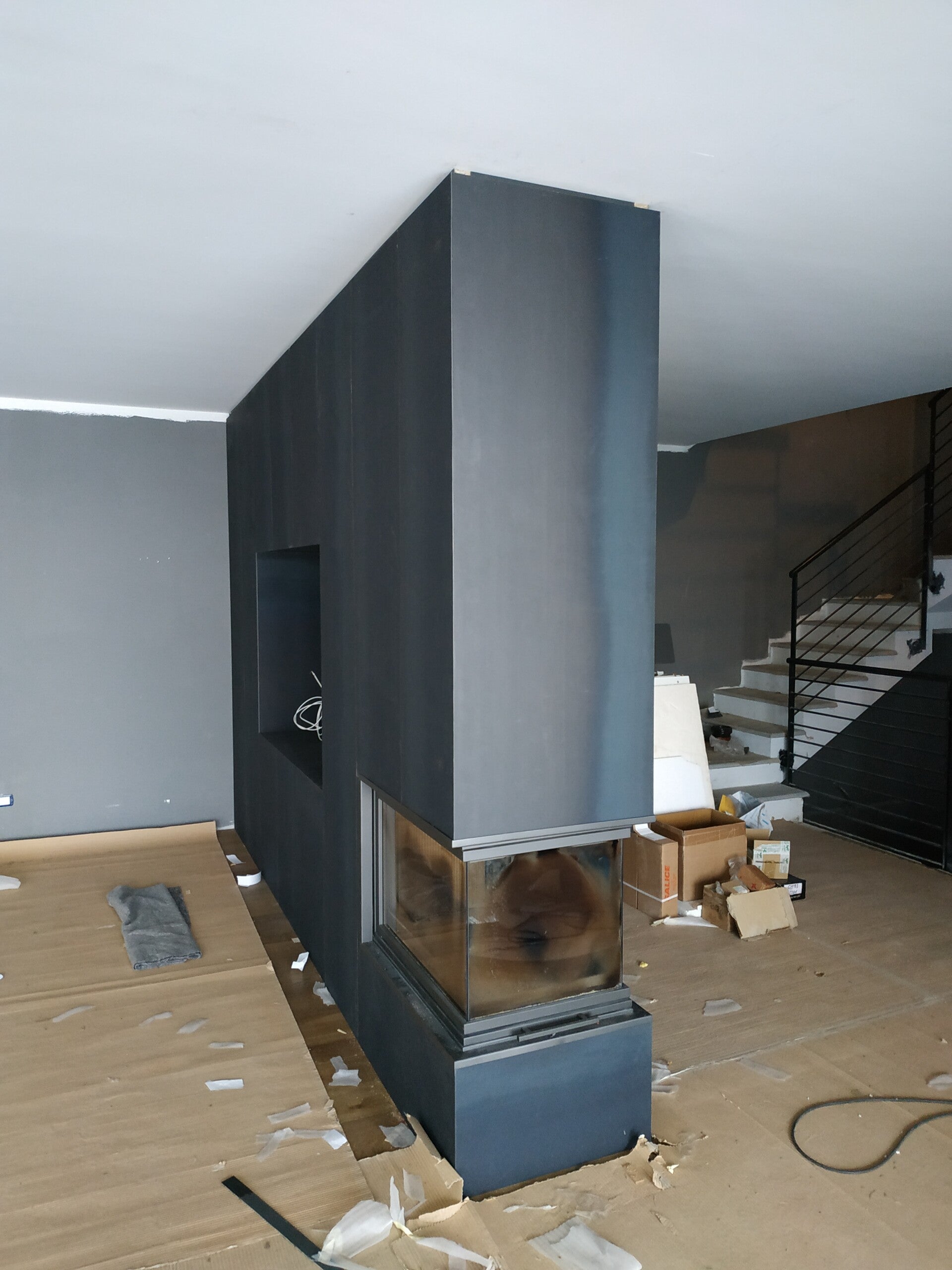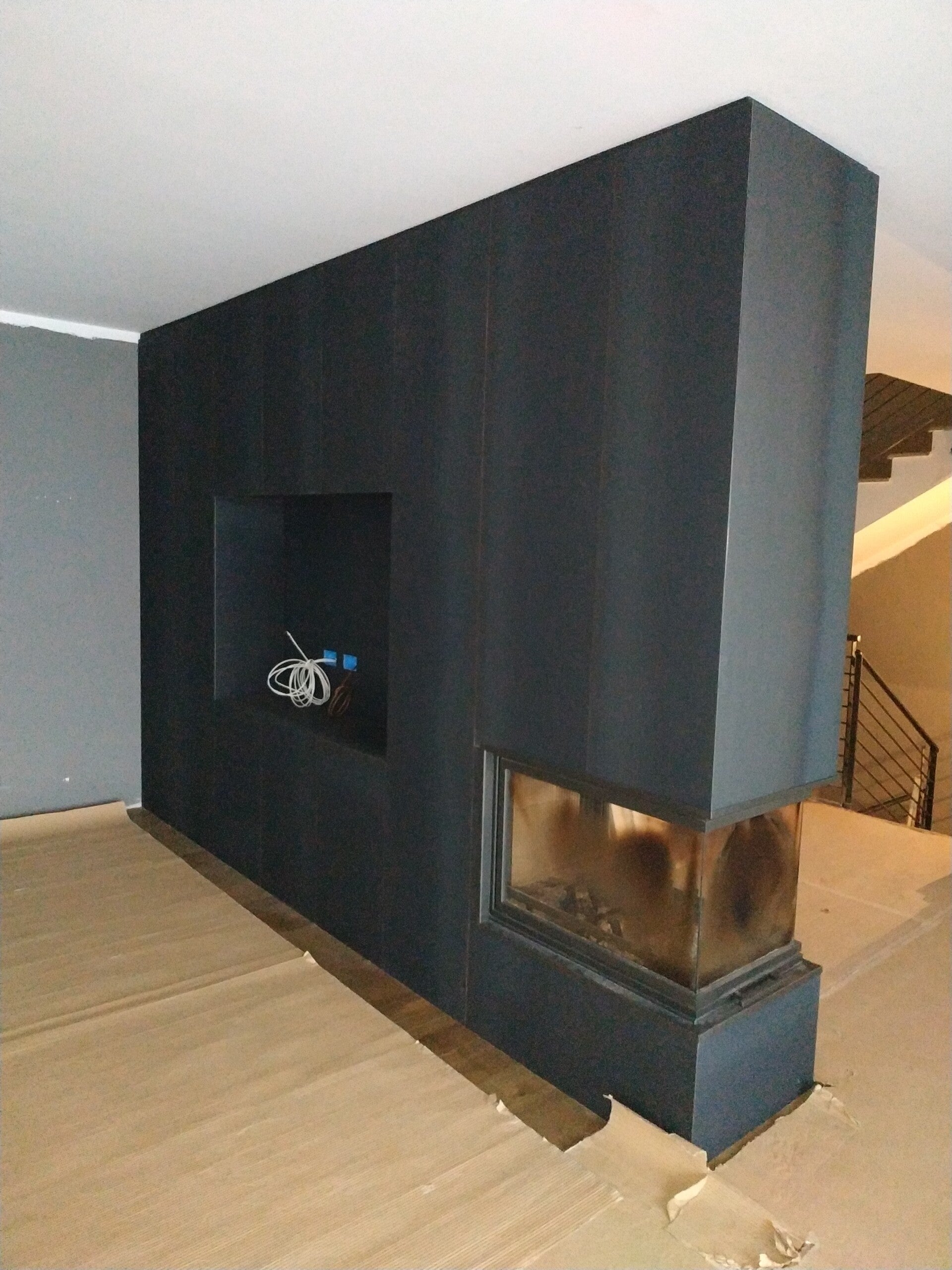 Parete divisoria rivestita in metallo, zona sala e scale con vano televisore, camino, nicchie e ripiani. Cavallasca (CO)